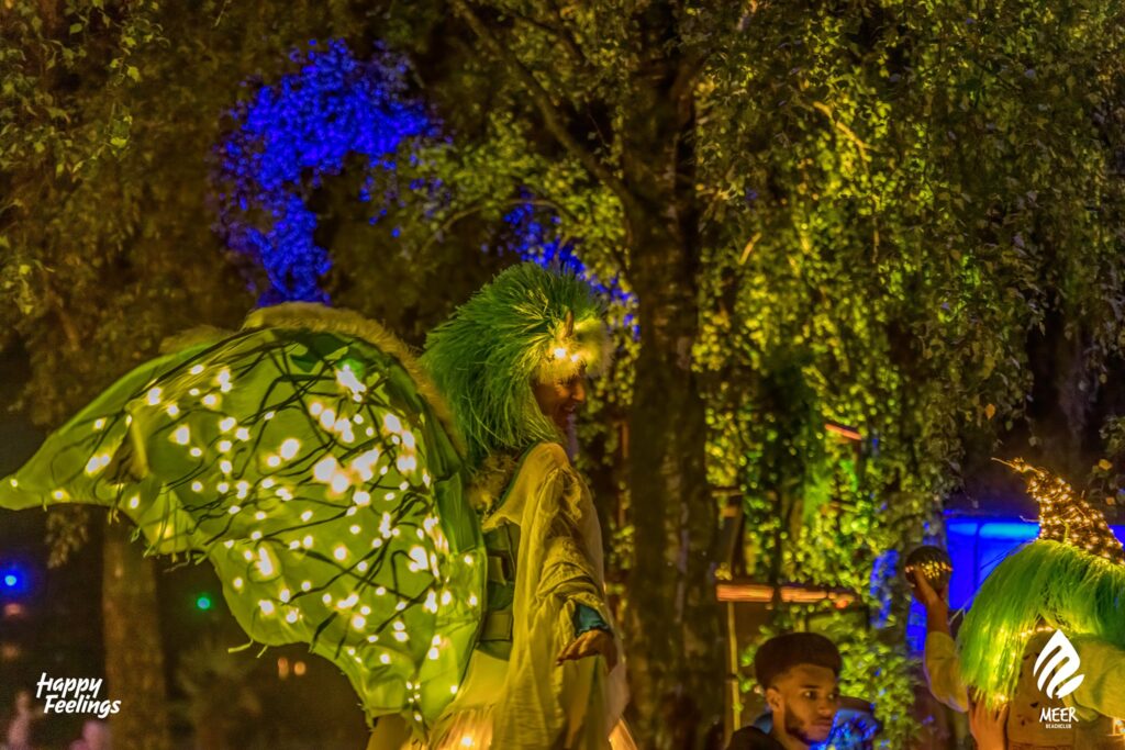 Christmas acts with stiltwalkers in parade in various white outfits. Beautiful in the dark winter months and around Christmas. The costumes are provided with led lighting. Raaf plays with the family ‘lightning night’ in different variants.
